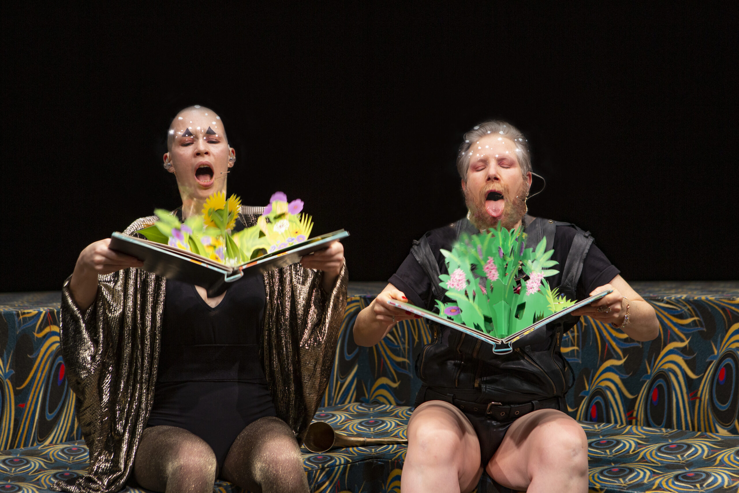 Limbs submerge into sprawling book pages. From inorganic and organic elements, sounds and movements, new beings assemble, form chains of interaction, and disperse again into the next composition. The materials, bodies, sounds and objects make each other pulsate until object and subject, touching and being touched, speaking and being talked about, grasping and being grasped, singing and being sung become indistinguishable. From the harmony of the body’s interior and exterior, new worlds emerge and pass away – resonant spaces that point to completely different, new, perhaps future ways of being with, around and in each other. – Luise Meier