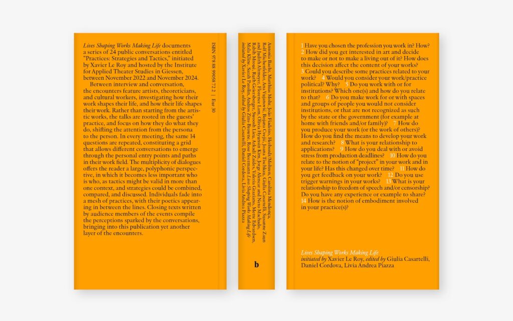 Lives Shaping Works Making Life is a collection of 24 dialogues conducted by artist and scientist Xavier Le Roy in exchange with artists, cultural practitioners and curators on the subject of artistic practices. Under the title ‘Practices: Strategies and Tactics,’ they were organised in conjunction with the Institute for Applied Theatre Studies in Giessen as public-facing conversations between November 2022 and November 2024.