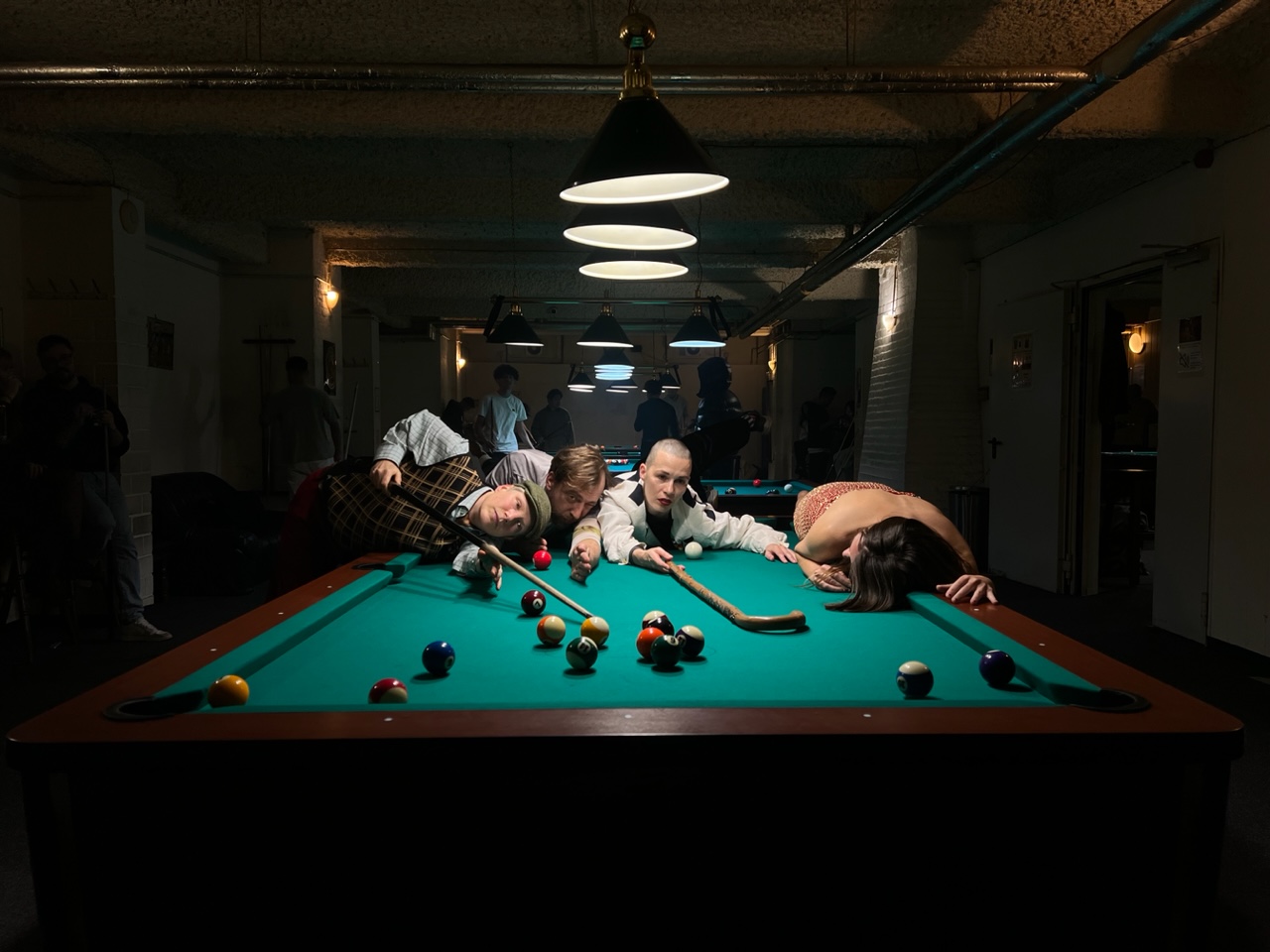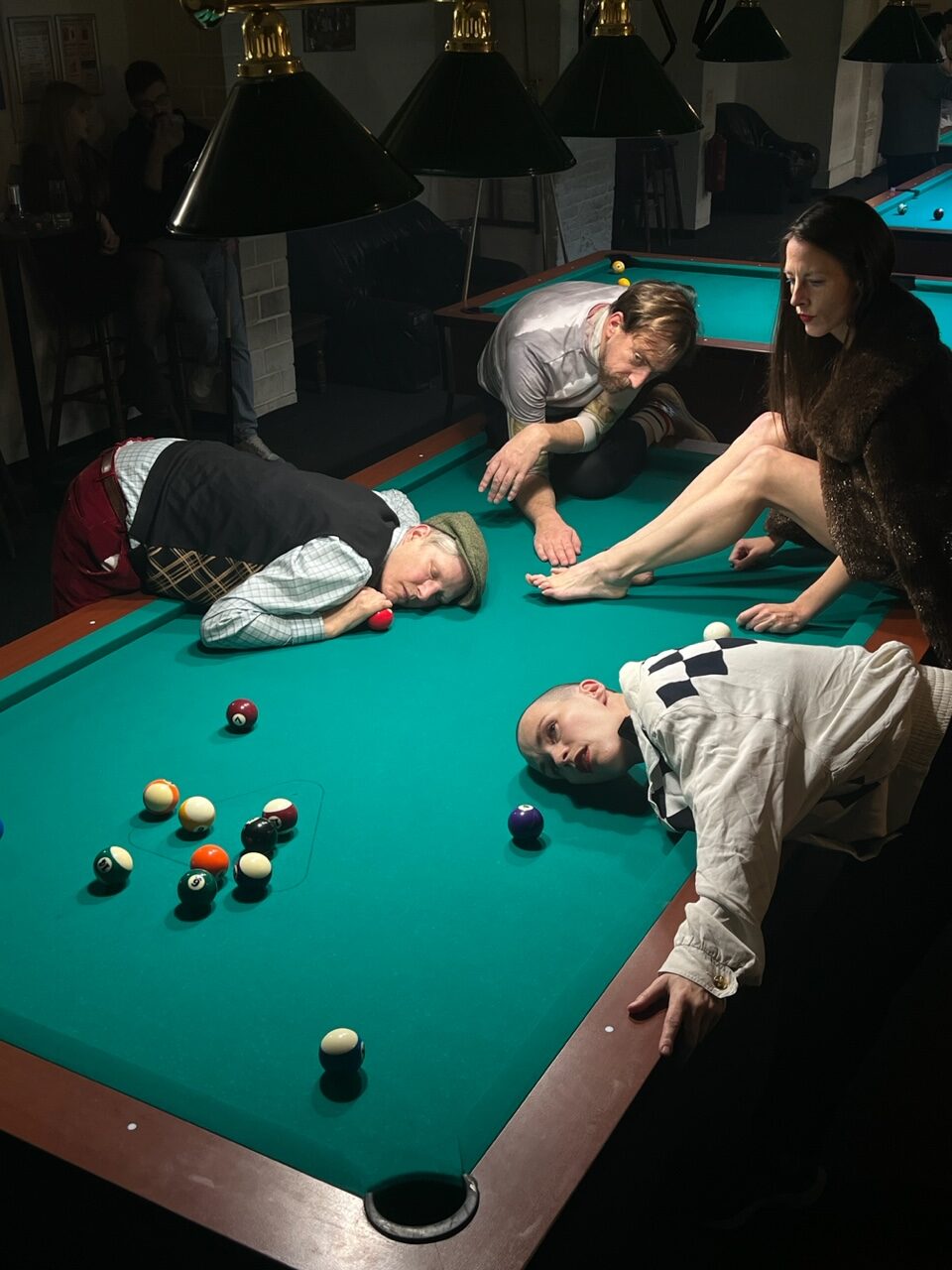 In Nadia Lauros visueller Installation, einem überdimensionalen Billardtisch, entfaltet sich ein Feuerwerk vielfältiger Referenzen an Genres, von der Bauchrednerei bis zum Stummfilm. Die vier Choreograf*innen bewohnen Werke, die jenseits von gut und schlecht existieren – Werke, die ihre eigenen Kunstregeln aufstellen. So wird beispielsweise Kurt Schwitters’ ‚Ursonate‘ in einer bewusst „schlecht entsinnten“ Version als Antwort auf die Frage nach Sinngebung vorgetragen. Claire Vivianne Sobottke singt das Lied, das Tabea Blumenschein in dem Film ‚Bildnis einer Trinkerin‘ von Ulrike Ottinger von sich gibt; die Gruppe lip-synct den Track ‚Die Schuldstruktur‘ von der ‚Tödlichen Doris‘ nach verschiedenen absurden Gerichtsszenen im ersten Teil des Stückes. In einer Serie von Szenen eignet sich das Quartett das Äquivalenzprinzip des Fluxus-Künstlers Robert Filliou an und erprobt Tutorials sowie Schauspielszenen als „gut“, „schlecht“ oder „nicht gemacht“. Ergänzt wird dies durch Lieder mit autobiografischem Bezug, die Fragen der Selbst- und Fremdbewertung verhandeln. Zum Schluß wird durch Tanz und Diskussion auf den ‚Veitstanz/Feixtanz‘ von Gabriele Stötzer reagiert, der vor einem Erbgericht untersucht und mit autobiografischen Fragen aufgeladen wird.