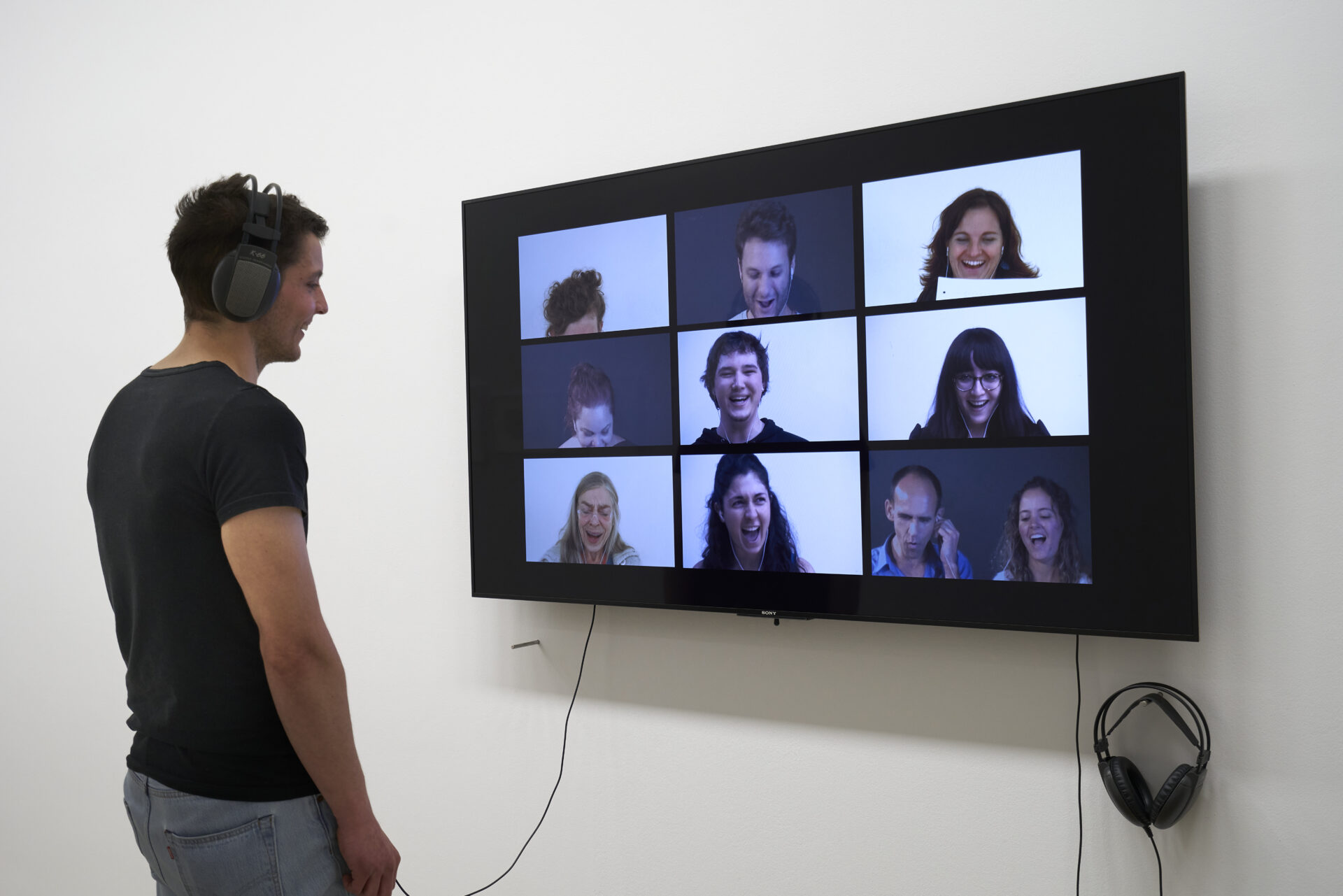 The direct action of laughter on the body is the subject of numerous contemporary works in which artists emphasize the liminal character of laughter. To integrate it into a performance, a sculpture or a painting is to introduce a caesura. Where there are no words, no explanations, there is laughter. This is the case in the performative actions of artist Antonia Baehr, who is interested in the materiality, quality and variability of laughter. Baehr’s laughter is liberating but also disquieting, communicative but also exclusionary, pleasurable and aggressive, and above all paradoxical and ambiguous. The performer stages the acoustic and physical phenomenon of laughter in direct relation to the body. She confronts us with her various laughs without contextualizing them, thereby underlining the disturbing nature they can take on. When we don’t understand what generates it, laughter is confusing and symbolizes the absurdity of our lives. In her 2008 book Rire Laugh Lachen, Antonia Baehr writes in her preface: „I was interested not only in the mechanics of laughter and its physiological components, but also in its quality as a gesture, an expression devoid of cause and effect, a manifestation of body and sound. In this way, laughter enables us to experience the loss of control over our bodies and, metaphorically, over our lives. It embodies the possibility of an interruption that encourages reflection and perhaps greater freedom. By tipping us into another reality, laughter provokes our doubts and instabilities, but also nourishes our courage and risk-taking.