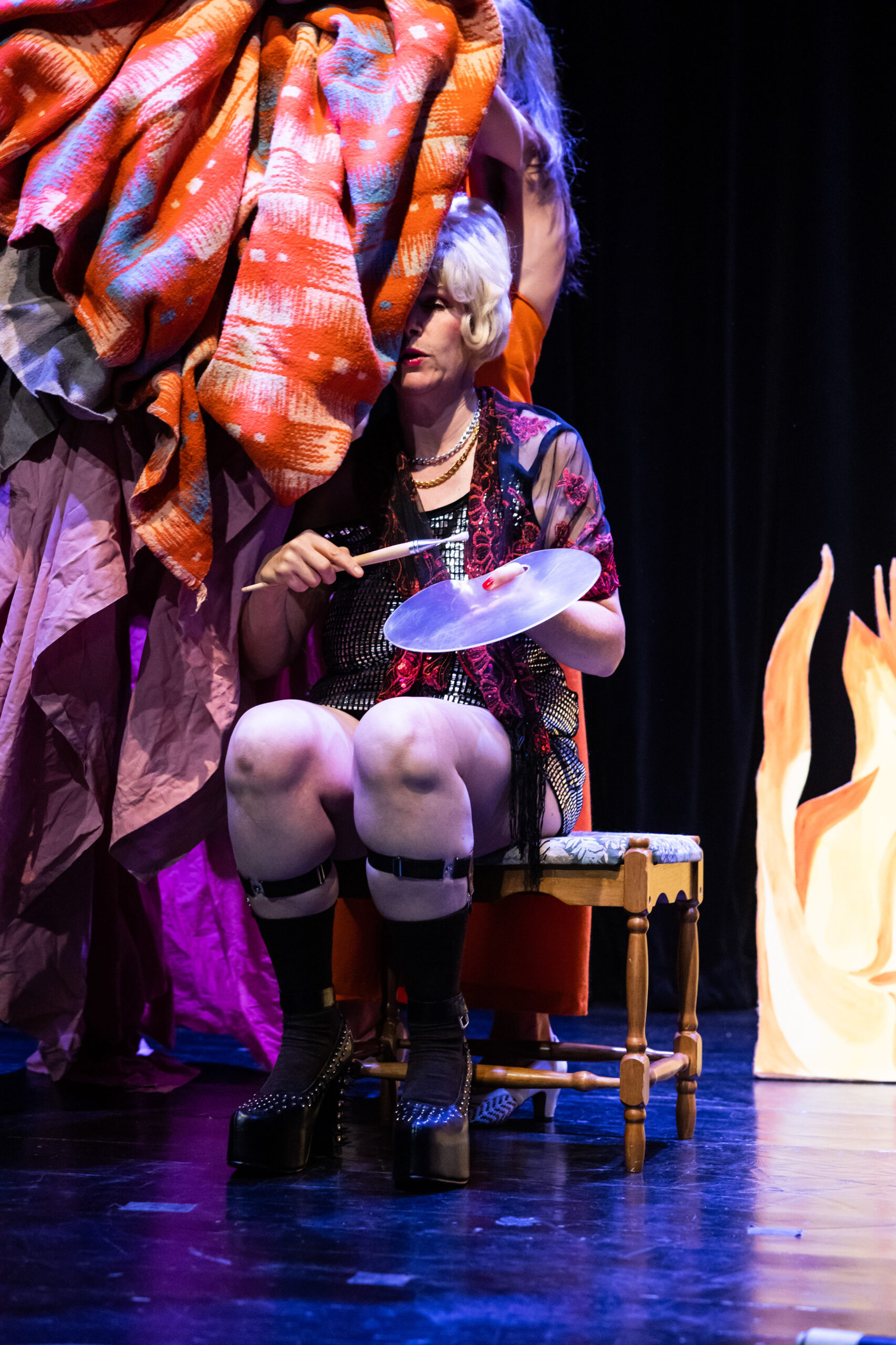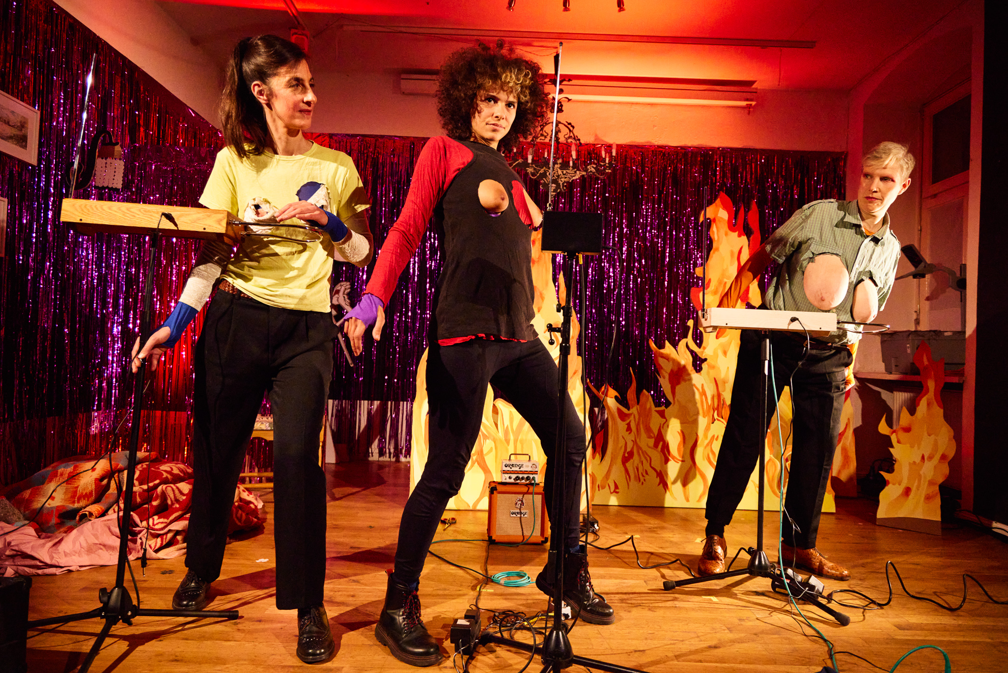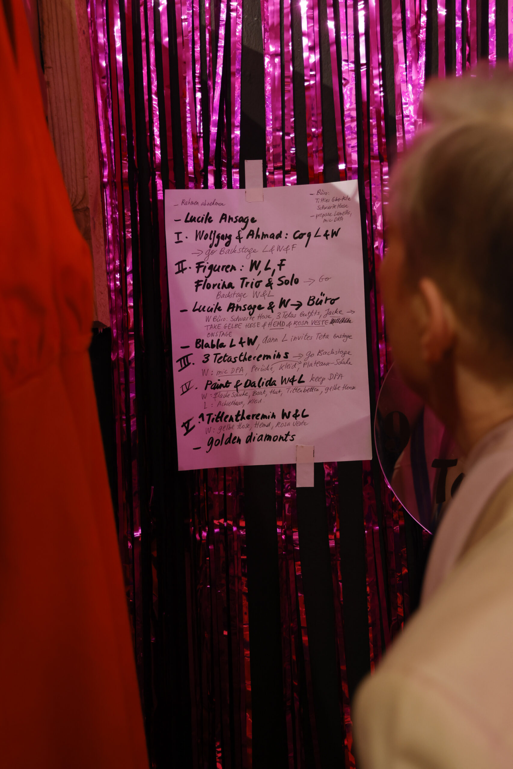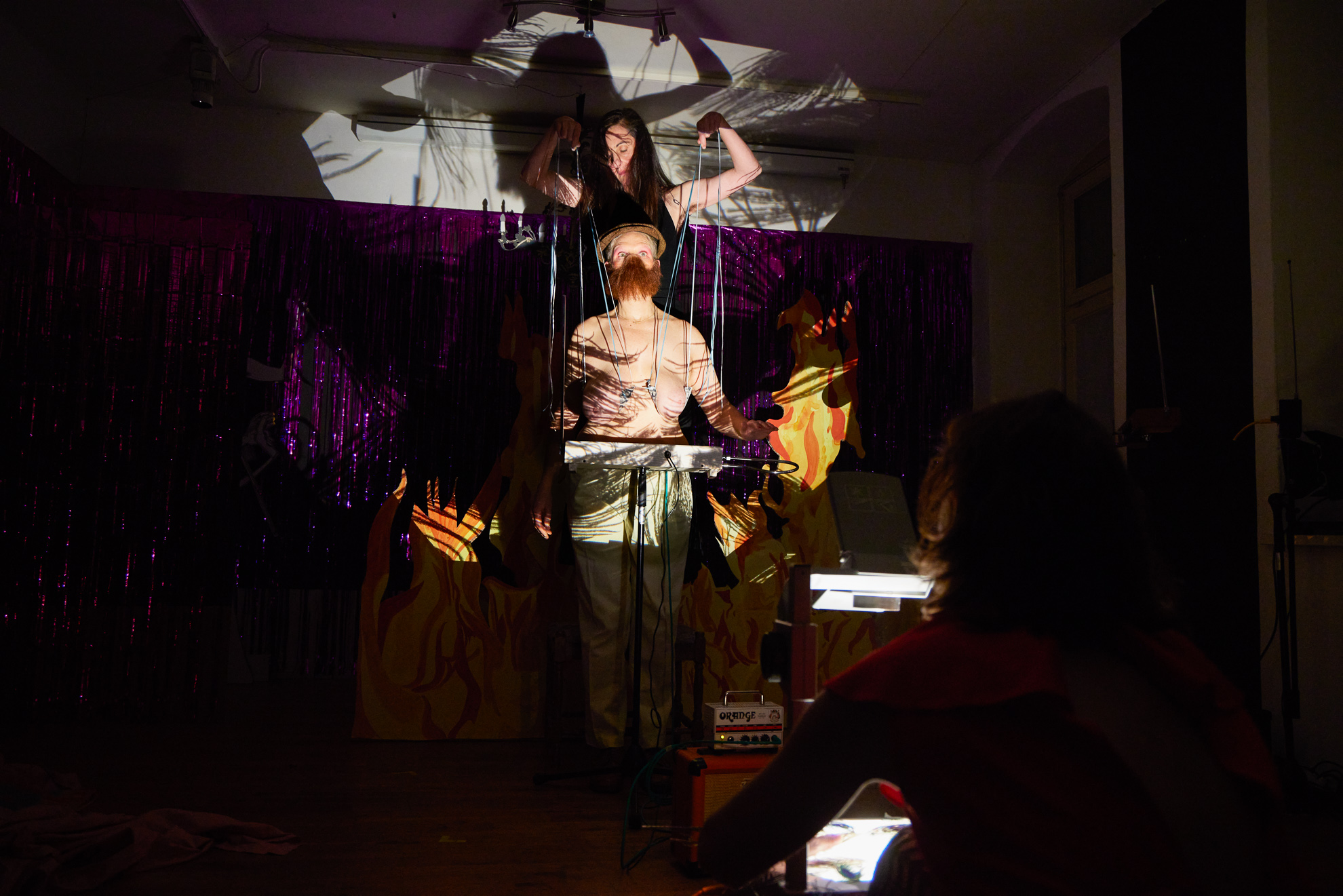 “[…] The small stage, framed by purple lametta and glowing orange and uranium yellow cardboard scenery, is the setting for a round dance of little glowing moments of joy, “strange and floating, with no straight lines,” as Lucille Desamory mentions as we enter. Together with Werner Hirsch (aka Antonia Baehr), Desamory is co-hosting the evening. The alternating scenes are warm and amusing and despite their lightness, offer now and then a glimpse into the abyss.