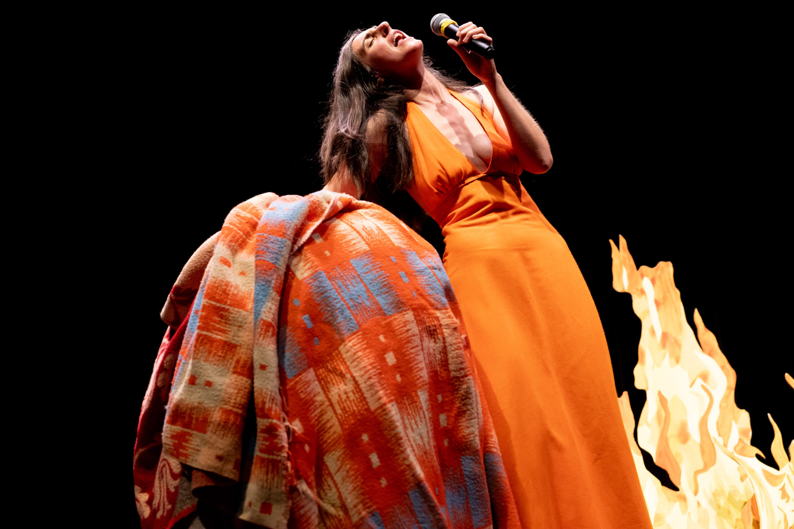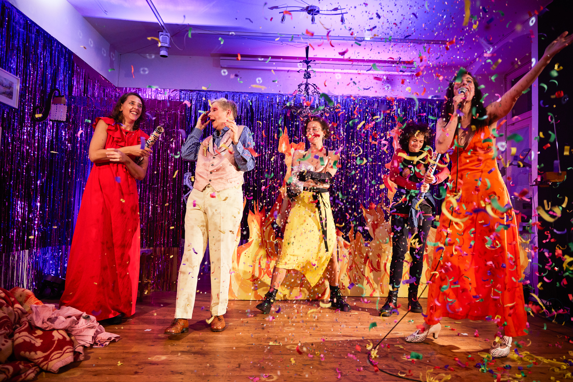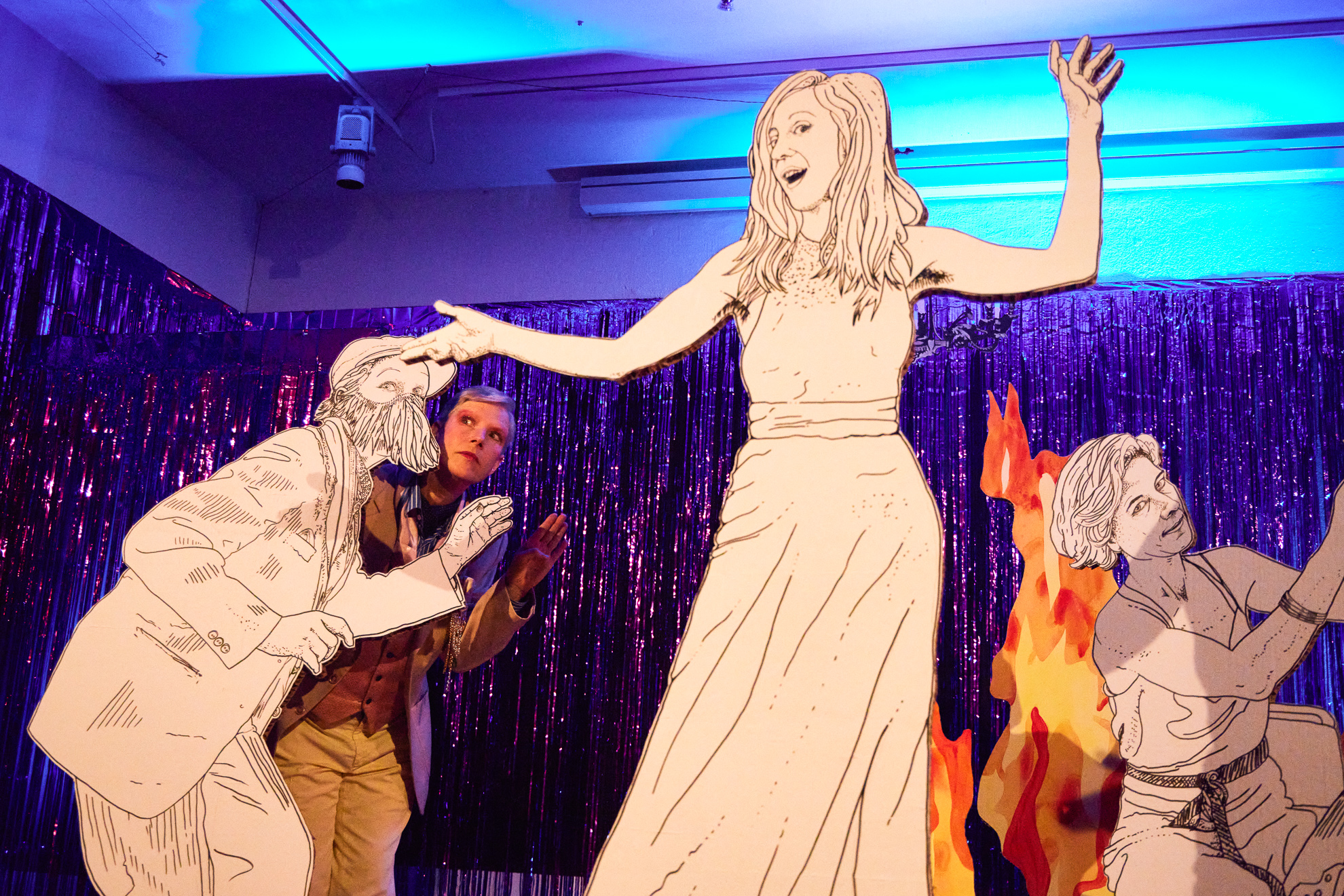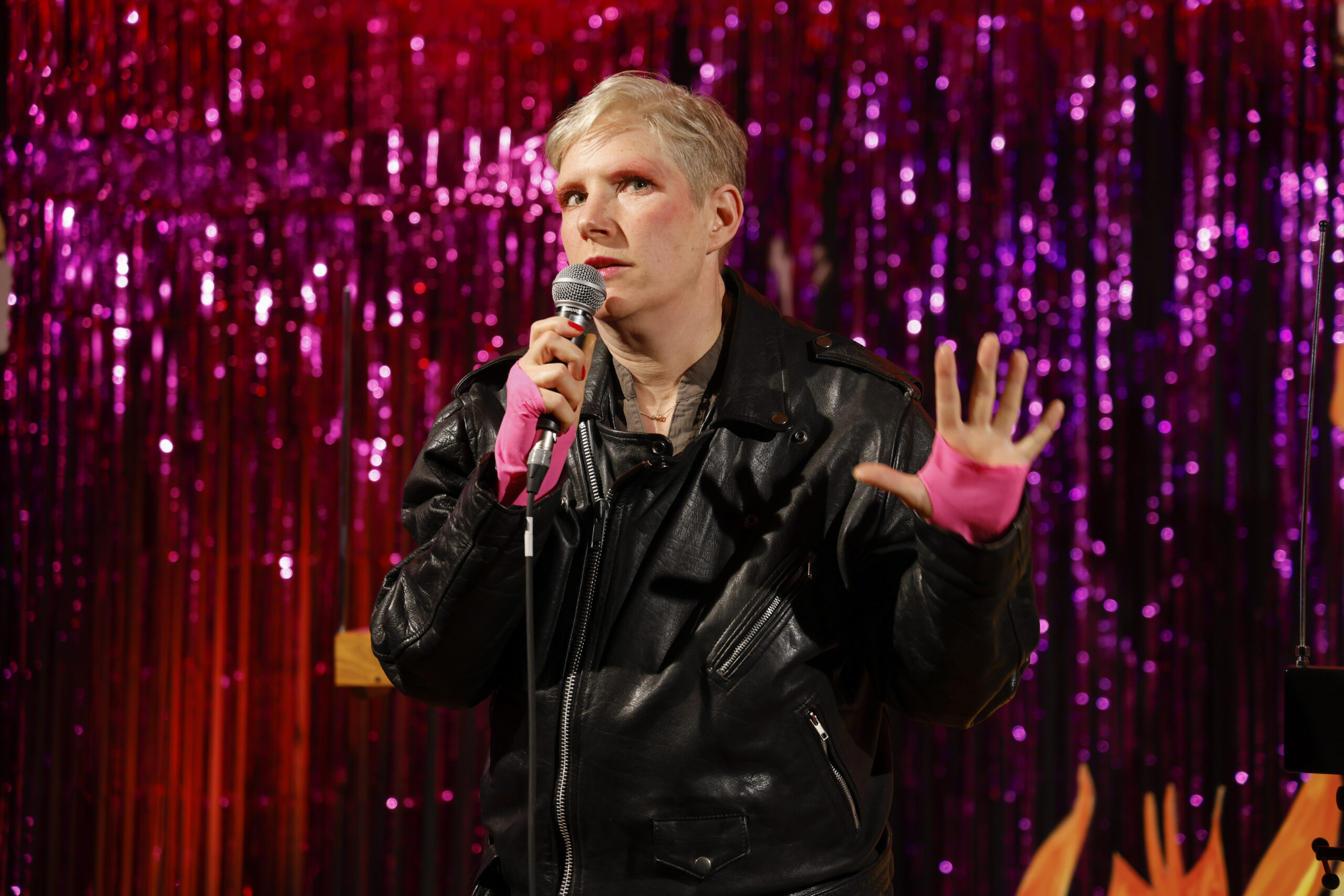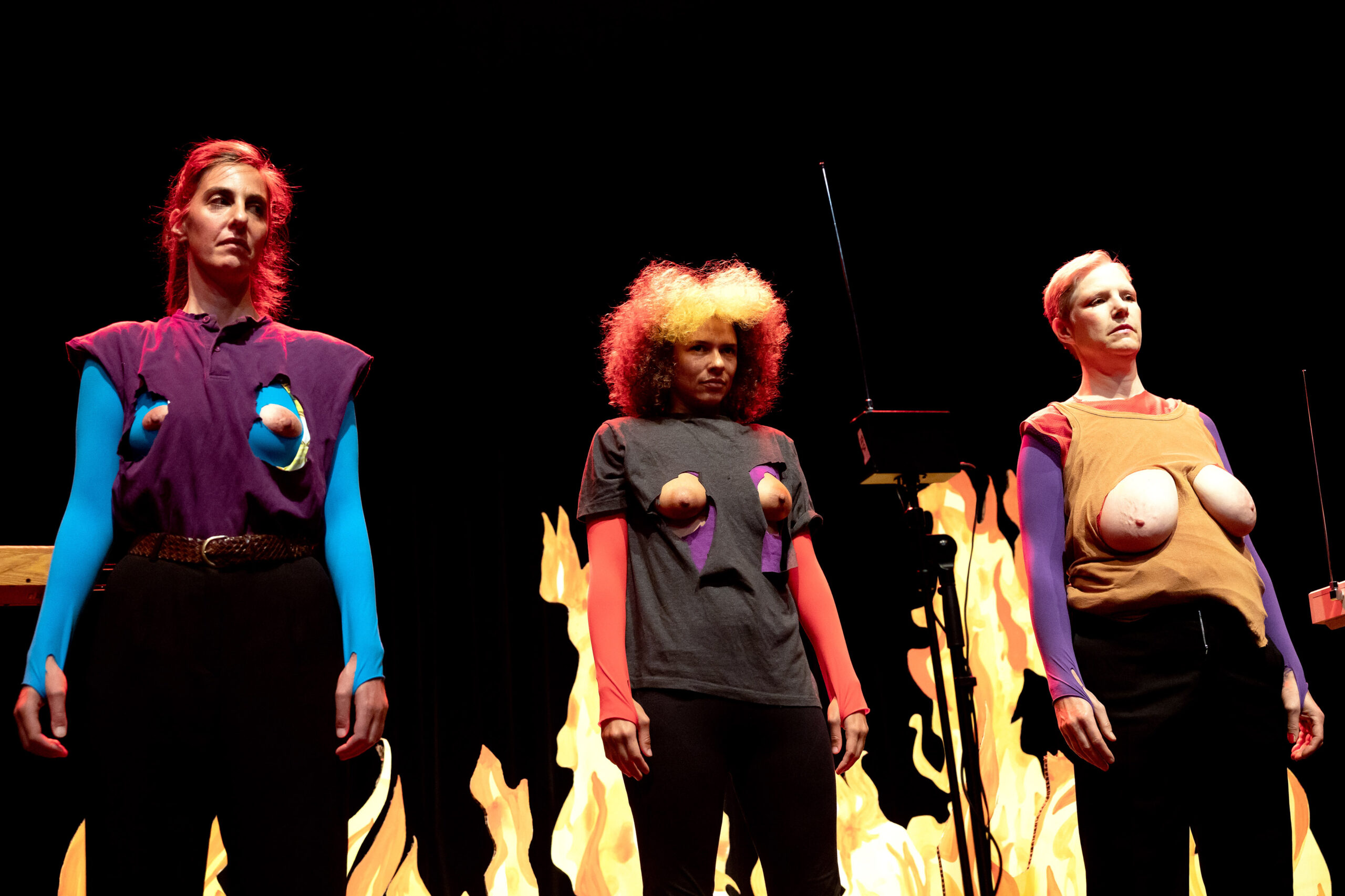 “[…] The small stage, framed by purple lametta and glowing orange and uranium yellow cardboard scenery, is the setting for a round dance of little glowing moments of joy, “strange and floating, with no straight lines,” as Lucille Desamory mentions as we enter. Together with Werner Hirsch (aka Antonia Baehr), Desamory is co-hosting the evening. The alternating scenes are warm and amusing and despite their lightness, offer now and then a glimpse into the abyss.