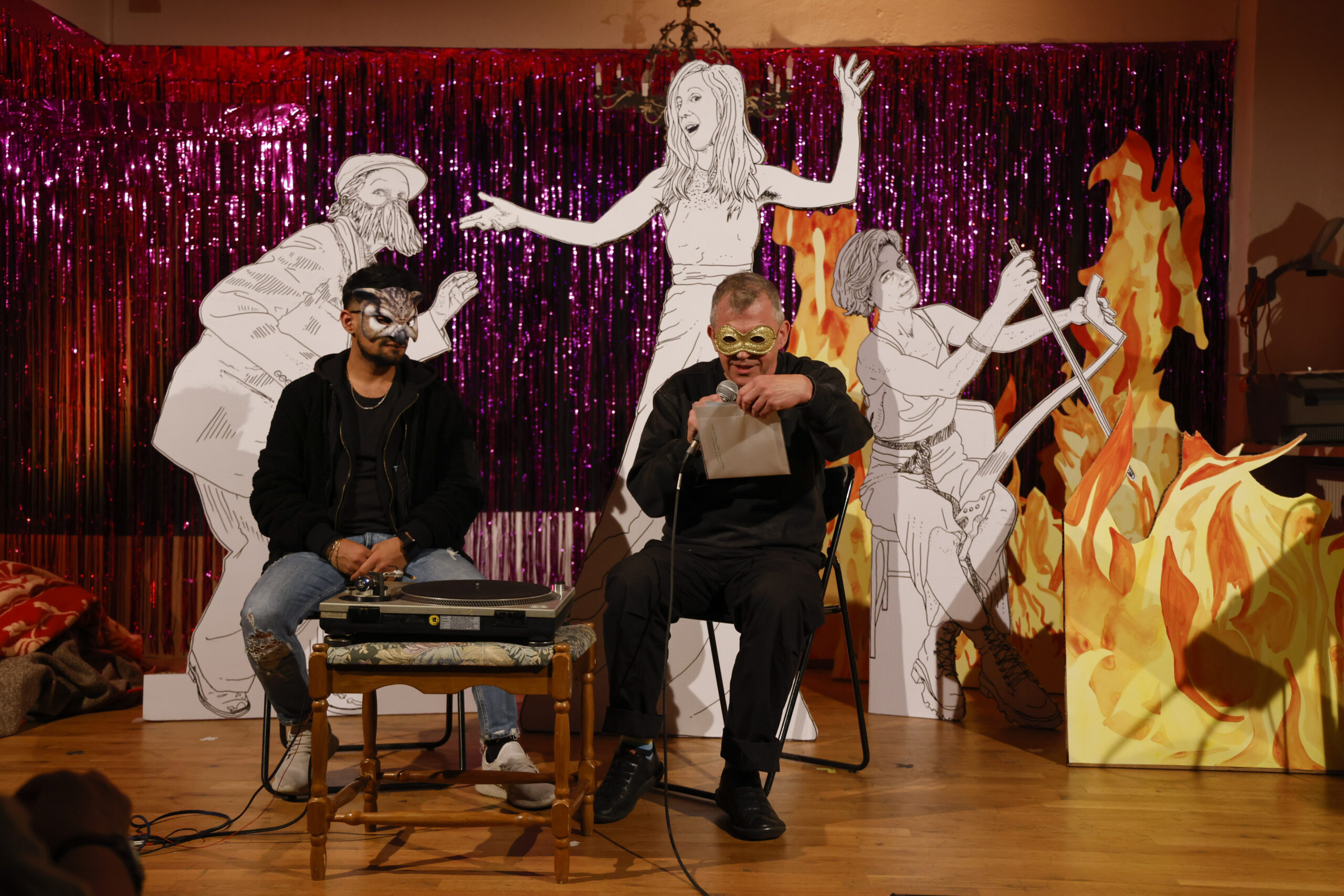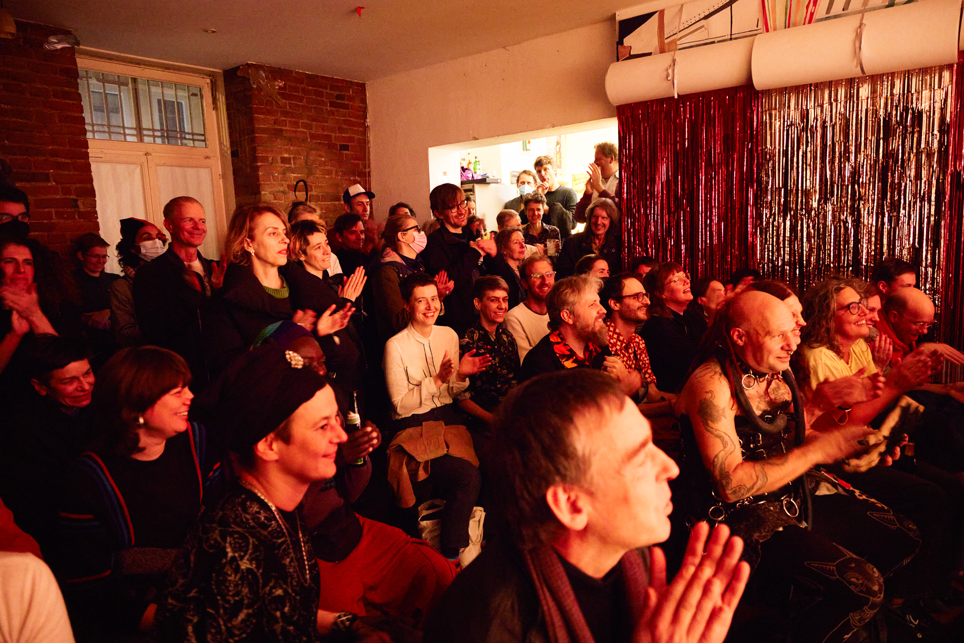 Feuer und Flamme (Fire and Flame) was a cabaret hosted by Werner Hisrch (aka Antonia Baehr) and Lucile Desamory during the pandemic in October and November 2021. It took place at night in a gallery in Berlin Kreuzberg that is deeply embedded in the neighbourhood’s history and life: Galerie ZeitZone, and left the audience drowning in glamour. During the day the gallery was open to showcase an exhibition with works on paper and an installation by the artists.