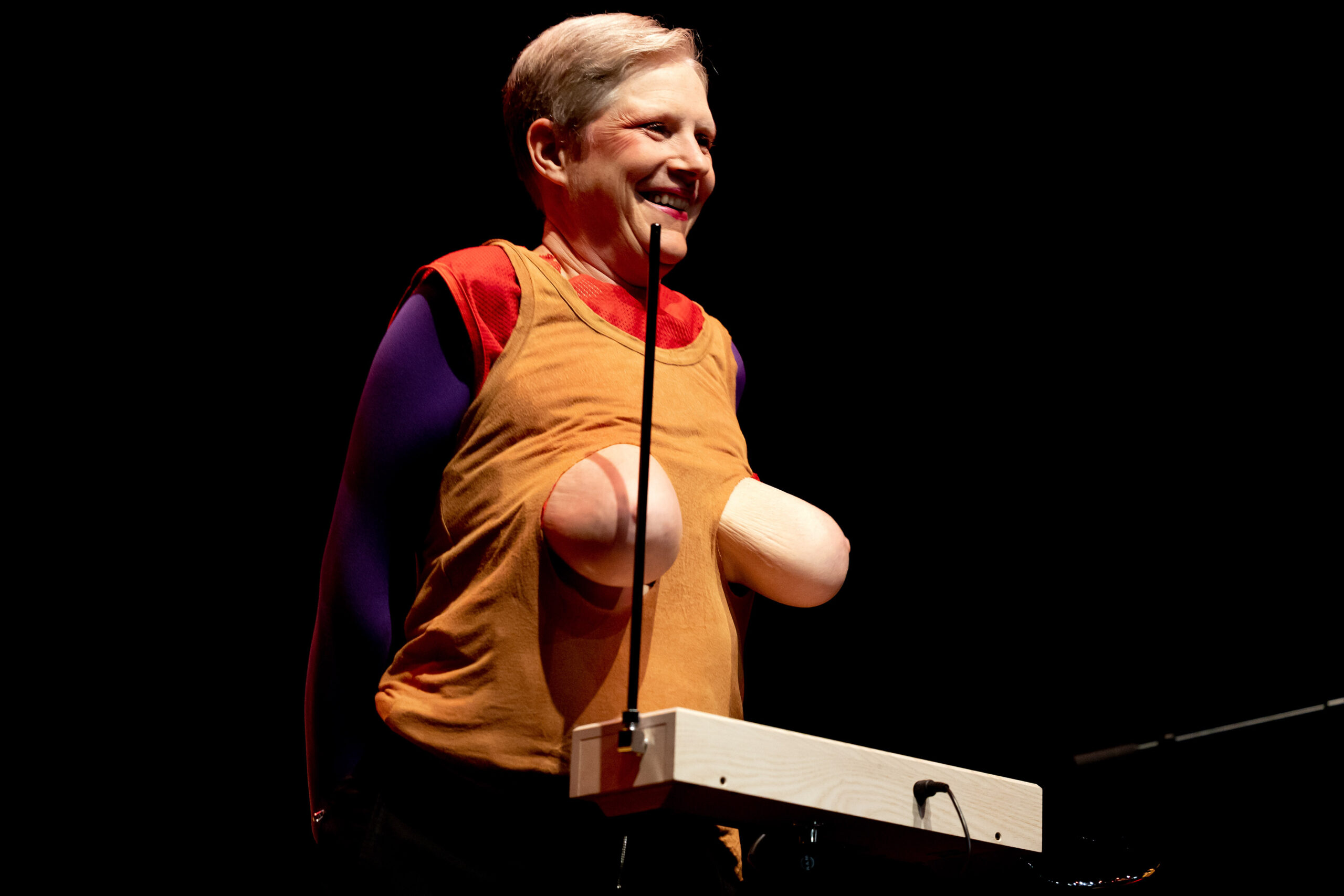 We listen to the throaty cries and gurgling sounds of the giant auk, a seabird that became extinct in the 19th century – interpreted by the Icelandic actress Kristbjörg Kjeld, recorded on vinyl and played on stage by the elf researcher, musician and artist Wolfgang Müller and his companion Ahmad Hanad. The last breeding pair of these flightless and therefore defenceless birds, highly sought after by collectors and researchers, was killed in Iceland in 1844. Further extinct species appear as ghostly voice imitations in Werner Hirsch and Lucille Desamory’s marvellous breast puppet theremin duo. Other numbers include a musical saw, a German pop Schlager duet with a pile of talking fabric as well as a theremin striptease, played by Teta Lírica, Florina Speth aka Schloß Mirabell, Carola Caggiano and Dj Elke Echo.” – Bettina Knaup.