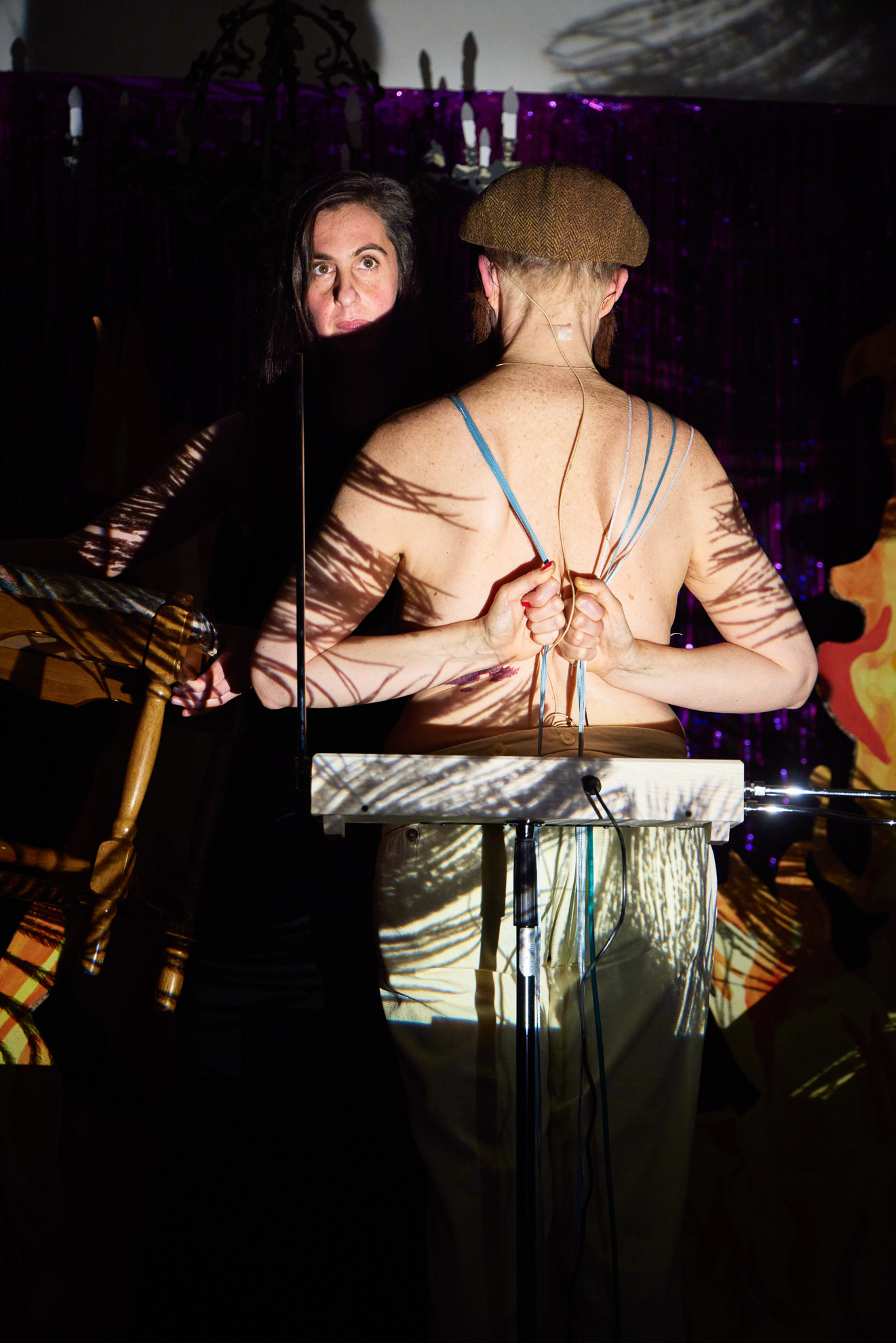 In the club, heaps of glamour seeped in the sound of a singing saw. On stage, breasts dance with the theremins surrounded by roaring piles, purring mustaches and much much more. Two evenings of shows and party in an exhibition by Lucile Desamory and Antonia Baehr at Galerie ZeitZone.