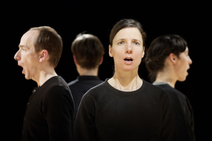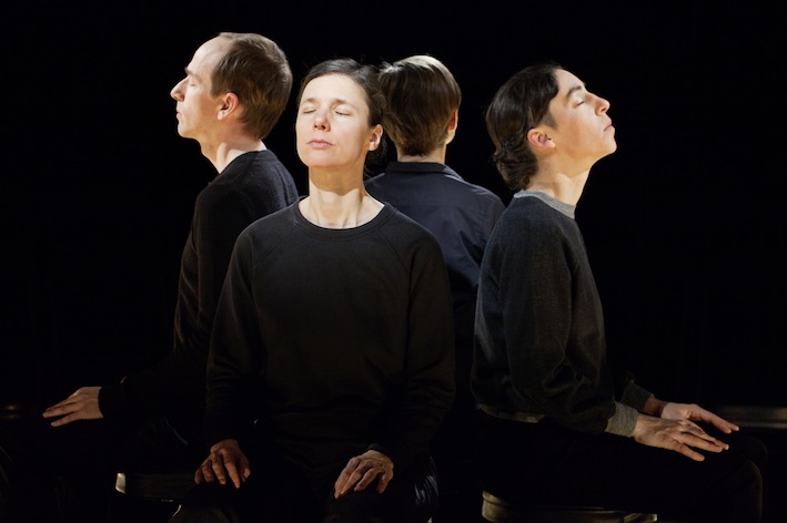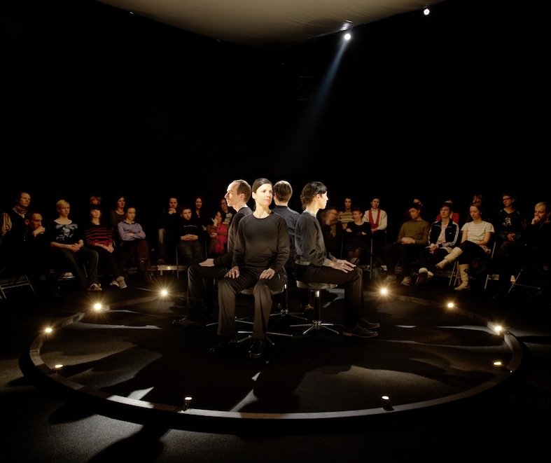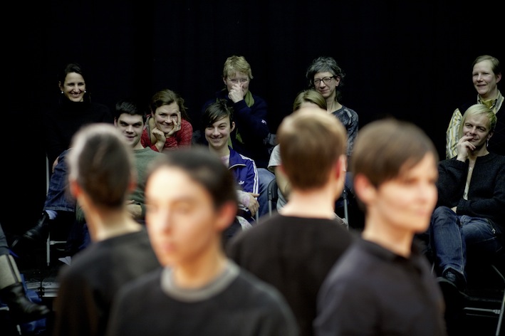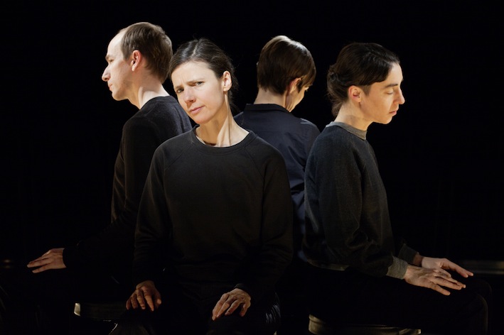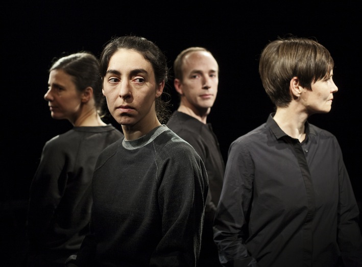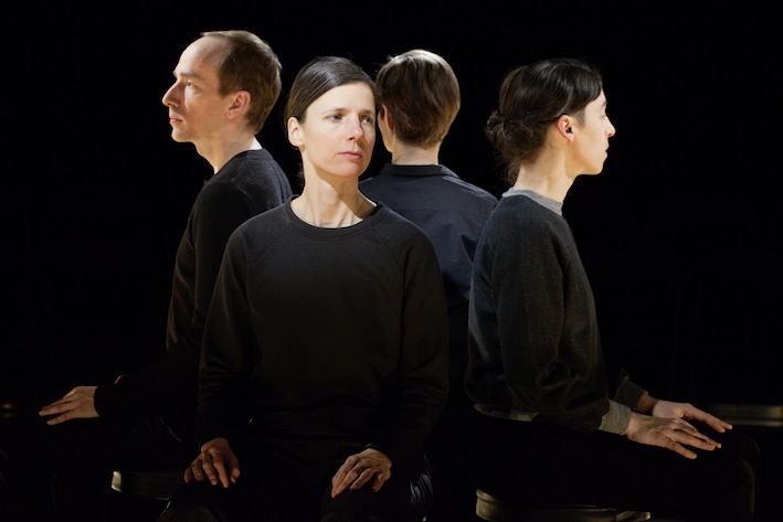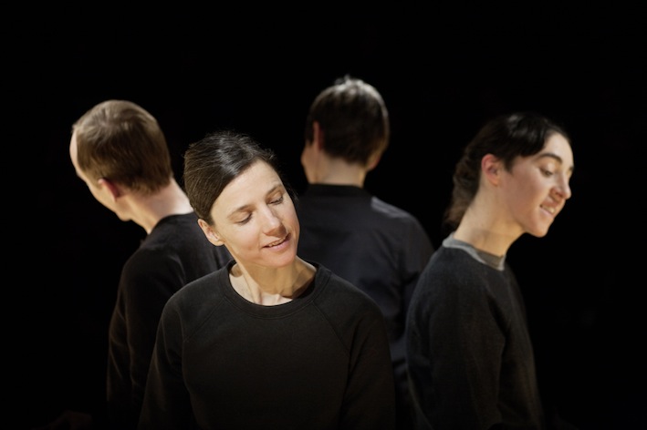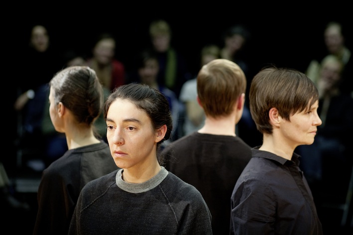 “In her performance For Faces, Antonia Baehr designs micro-choreographies for four faces. We sit directly across from the performers, around whom we are positioned circularly—too near for the comfort zone of the parquet and too far apart to precisely identify the mimetic agitations in the face of our vis-à-vis. The physiognomy becomes a stage where spectatorship itself, in all its intimacy and movement, openness and force, shows its face as theatrical action par excellance. Through choreography, the faces’ movements are deprived of their decodability as coherent facial expressions, they set a zoom of attention in motion. This zoom causes performer as well as person to disappear before our eyes, just as it radically places the performer at seeing’s disposal.” – Constanze Schellow